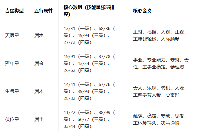 补充知识点:吉星搭配需遵循 “功能互补”,比如 “天医(招财)+ 延年(守财)”“生气(贵人)+ 天医(招财)”,形成能量闭环,避免单一吉星导致的短板(如单一天医易赚快花快)。