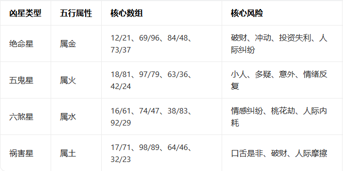 凶星主负面能量,并非完全不能用,需搭配吉星化解,且只能用弱能量凶星,避免强能量凶星(如一级绝命 12/21)