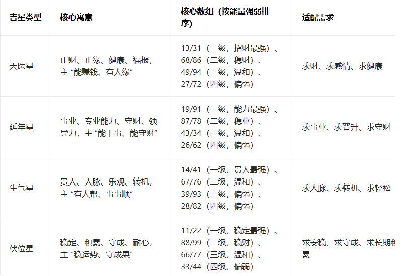 四大吉星是选尾号的核心,不同吉星侧重不同,先明确每个吉星的特质、数组的能量强弱,才能精准搭配,避免盲目选择。