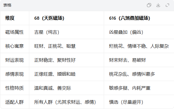 在数字能量学中,616 与 68 虽都包含数字 6,却分属不同磁场,吉凶属性、运势影响截然不同 ——68 是纯粹的吉星磁场,主打旺财旺姻;616 是凶星主导的复合磁场,利弊交织、隐患暗藏。